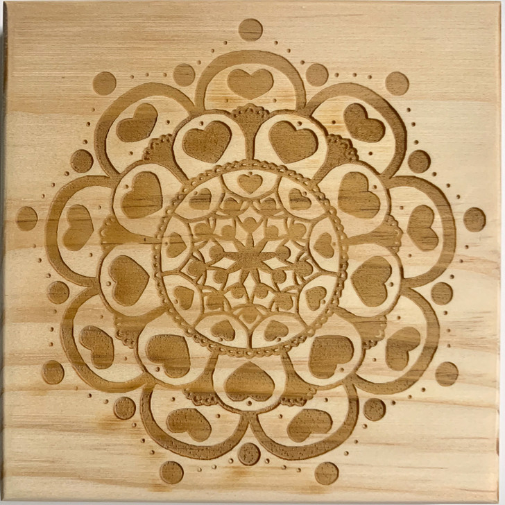 PEACE LOVE CRYSTALS Attract Love Mandala Grids are made of pine wood with a beautiful "Attract Love" mandala drawn and laser engraved by us.