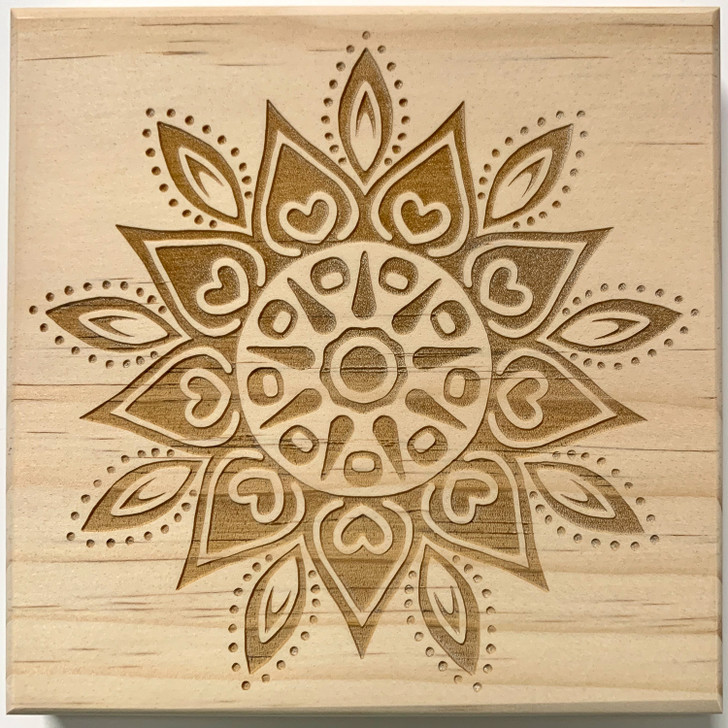 PEACE LOVE CRYSTALS Fertility Mandala Grids are made of pine wood with a beautiful "Fertility" mandala drawn and laser engraved by us.
