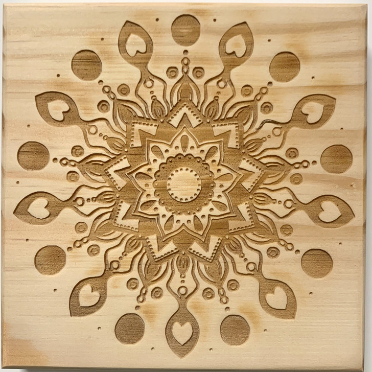 PEACE LOVE CRYSTALS Goddess Mandala Grids are made of pine wood with a beautiful "Goddess" mandala drawn and laser engraved by us.