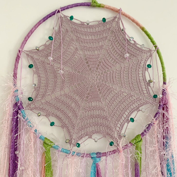 PEACE LOVE CRYSTALS Lola Dreamcatcher is approximately Width 26 cm x Length 89 cm (Top of ring to the bottom) in size. This one of a kind dreamcatcher is handmade by PEACE LOVE CRYSTALS with metal ring, wool, beads and crochet doily.