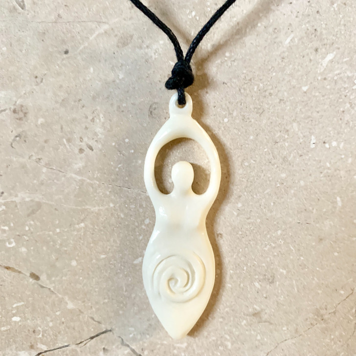PEACE LOVE CRYSTALS Hand Carved Bone Goddess Pendant is approximately 1.8 cm Wide x 5 cm Height. This pendant is strung onto a sliding adjustable cotton cord. This pendant is double sided.