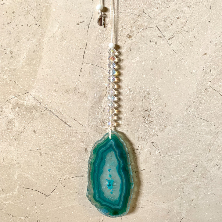 PEACE LOVE CRYSTALS Agate Slice Suncatcher is approximately (Agate Slice W 6 cm x H 11.5 cm) Hanging Length is 30cm in size and is made with an Agate Slice and Glass Crystal Beads. The Agate Slice Suncatcher pictured will be the one you will receive. Plus a free copy of our "Crystals & Minerals Metaphysical Properties Guide" by PEACE LOVE CRYSTALS*. Please take note of the size described as images are close-ups so you can see the quality we offer.